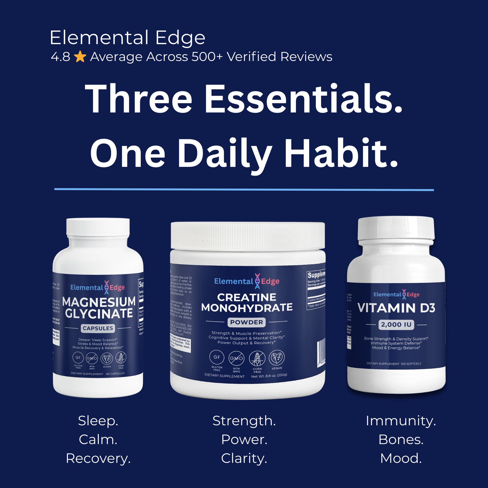 The Essential Edge Stack brings together the three most impactful, research-backed supplements for adults focused on strength, recovery, cognitive function, and long-term health — in one clean, properly dosed daily system. Three products that work better together than any of them do alone.