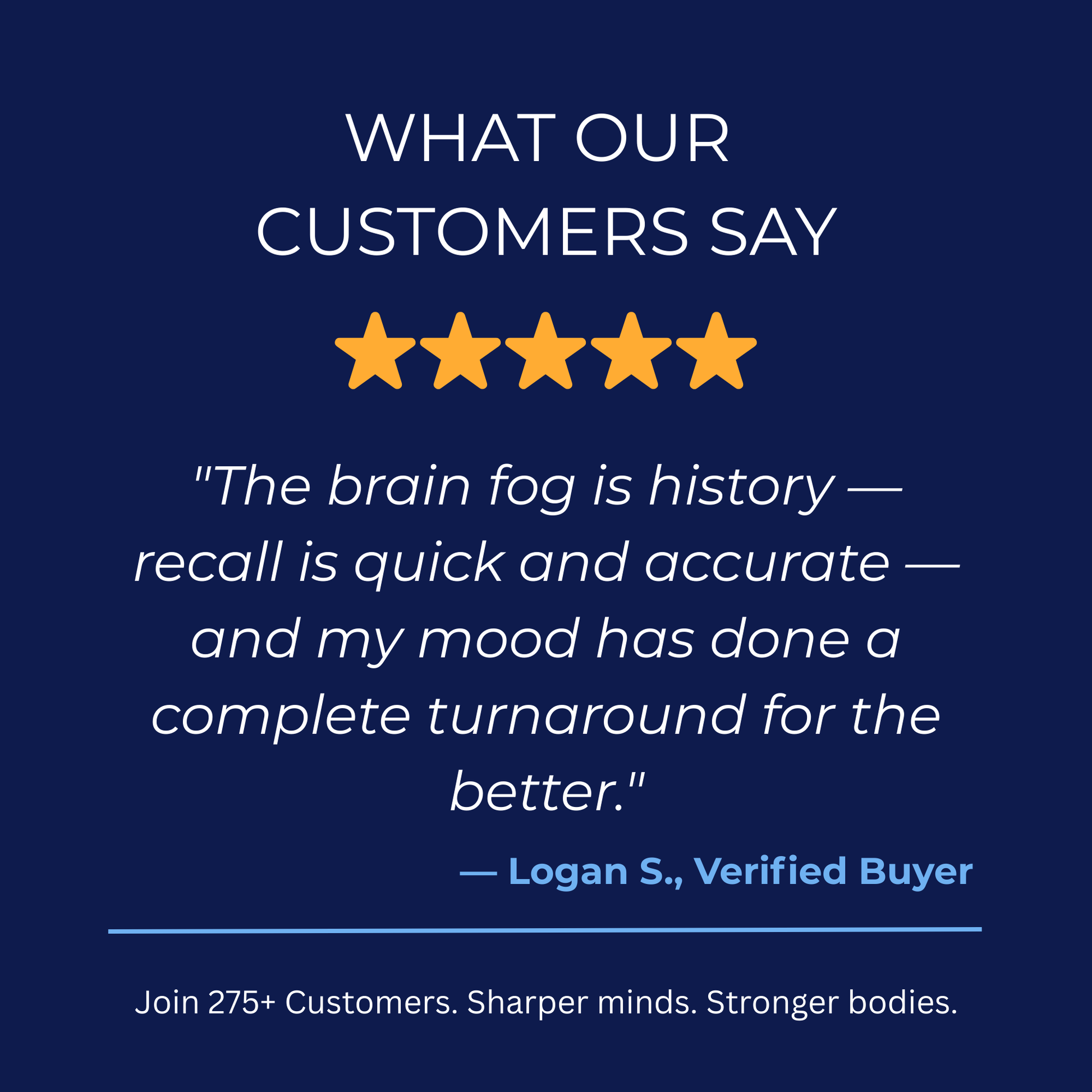 ⭐⭐⭐⭐⭐ Logan S. "Wrapping up my first full month with the Essential Edge Stack. The brain fog is history — recall is quick and accurate — and my mood has done a complete turnaround for the better."