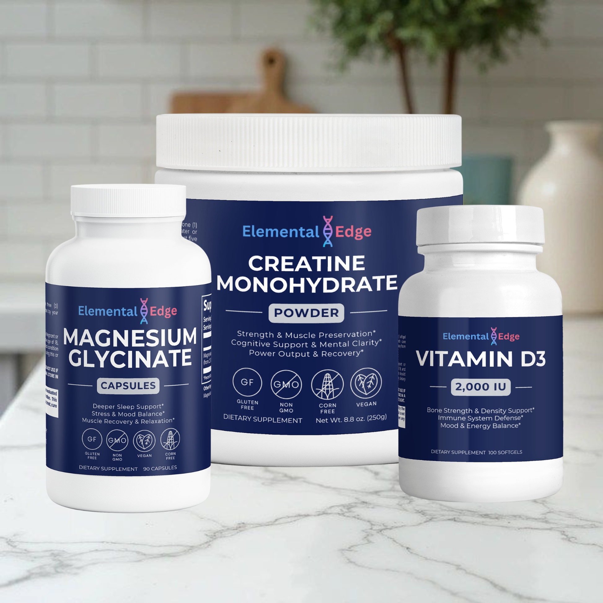 Magnesium is required for the activation and metabolism of vitamin D in the body — meaning your D3 works better when magnesium levels are adequate. Creatine supports cellular energy production in both muscle and brain tissue. Vitamin D3 maintains the musculoskeletal foundation that makes strength training productive long-term. Together they cover sleep, recovery, strength, cognitive function, immunity, and bone health — the full picture for adults who want to age with intention.