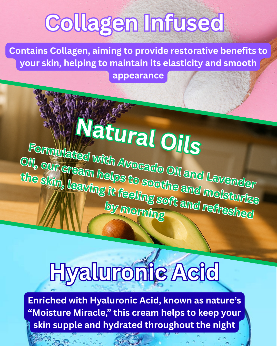 ✅ Hyaluronic Acid Hydration – Nature’s “Moisture Miracle,” locking in hydration to keep skin plump and dewy all night.
