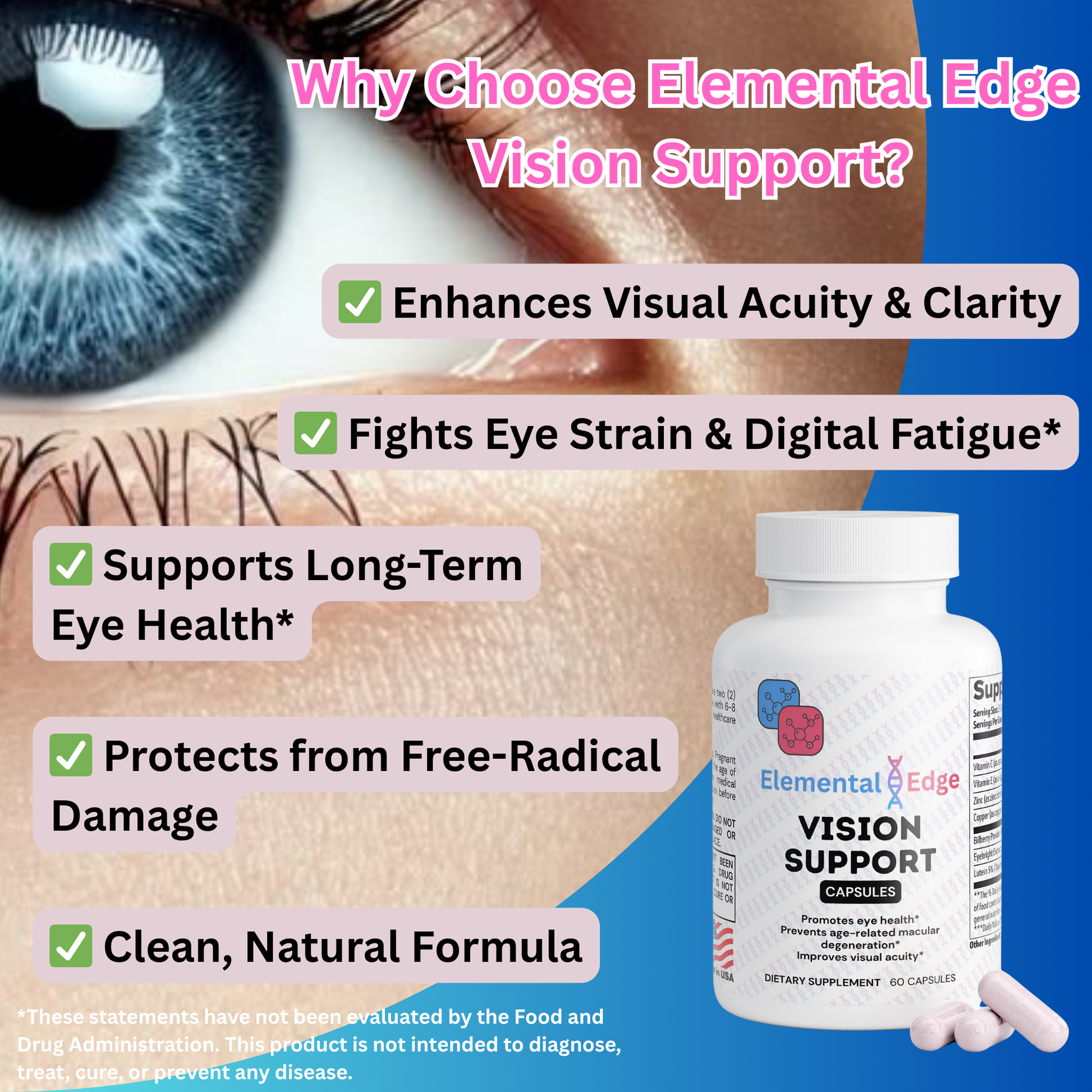 That’s why Elemental Edge Vision Support is expertly formulated to nourish, protect, and support eye health, helping you maintain sharp, clear vision at every stage of life.