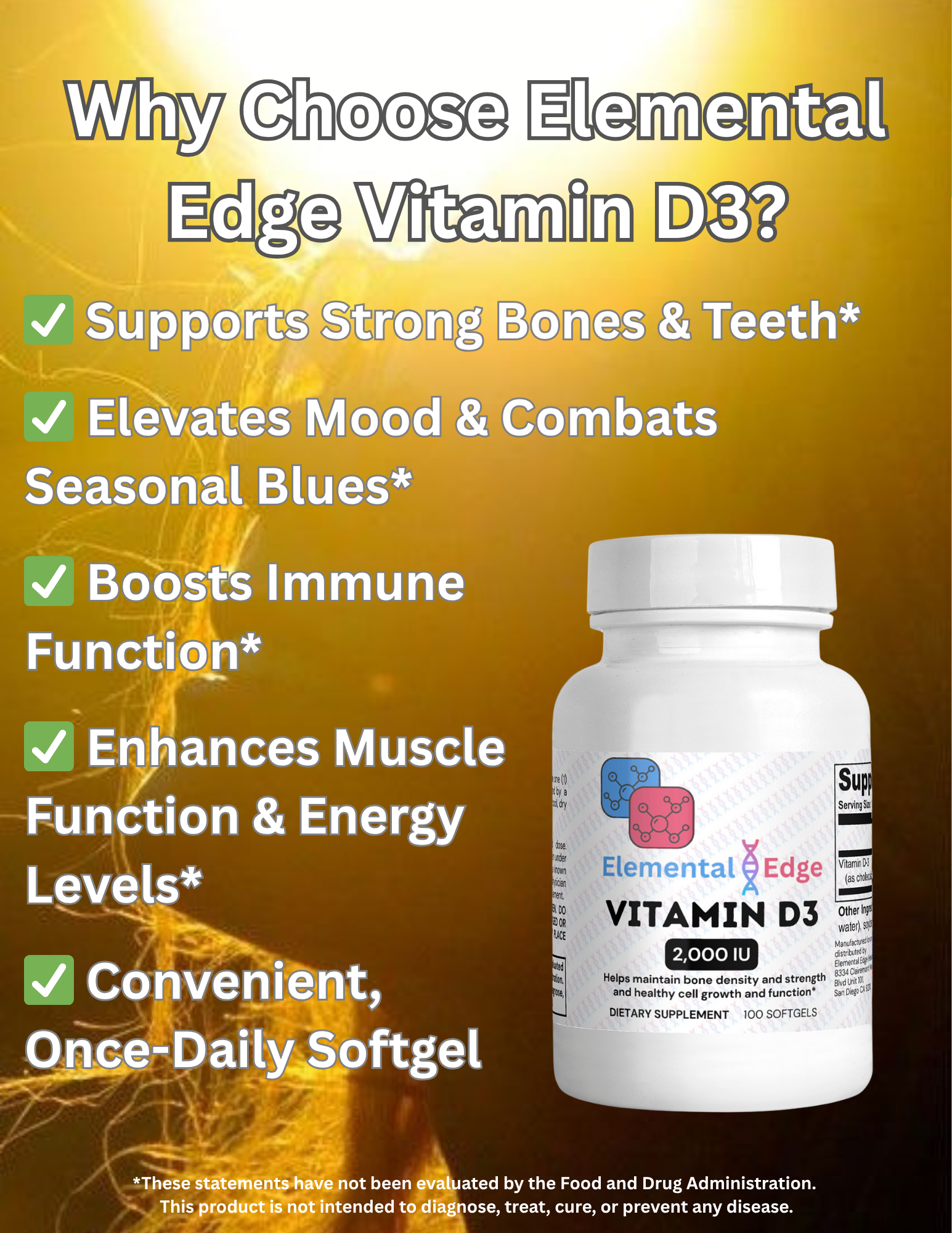Embrace energy, strength, and vitality every day with Elemental Edge Vitamin D3 2,000 IU — the sunshine vitamin your body craves.