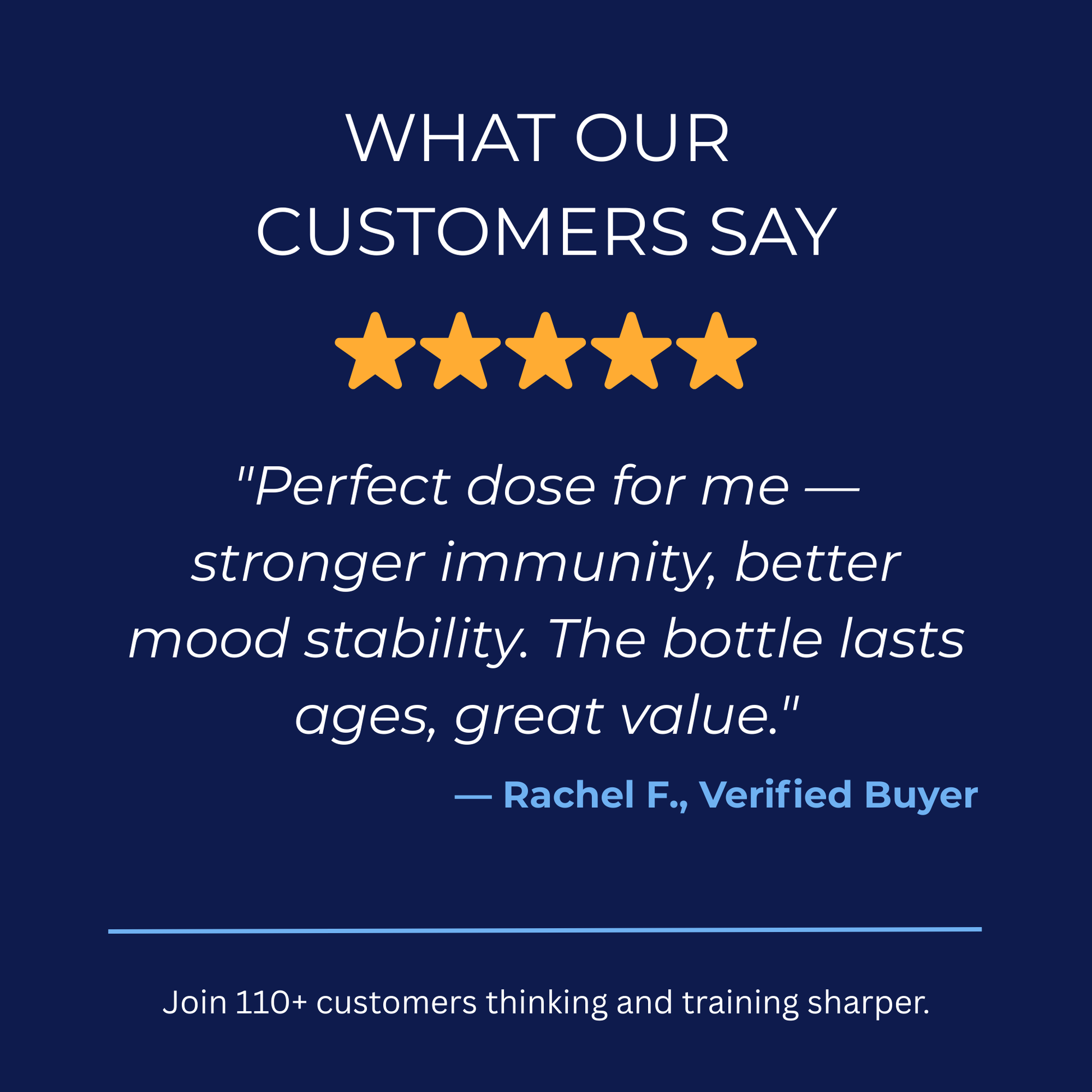 ⭐⭐⭐⭐⭐ Rachel F."Perfect dose for me—stronger immunity, better mood stability. The bottle lasts ages, great value. Five stars!"